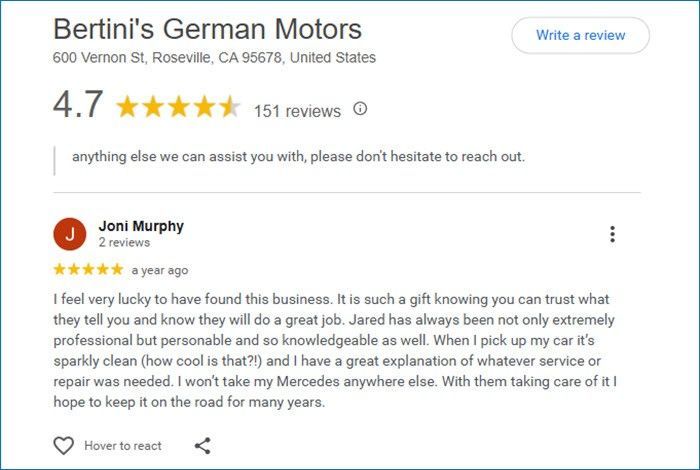 Bertini’s German Motors is one of the leading auto service providers for Mercedes automobiles for those driving in and around Roseville, CA. Having worked for many years with German cars, we understand the requirements and peculiarities of Mercedes cars and will be glad to help your car continue to operate efficiently. Whether diagnosing a problem with your flex disc or managing serious mechanical problems, our team ensures you don’t suffer a mechanical breakdown. You can schedule an appointment with our technicians by calling our service line or just stop by our shop to learn more about our services.